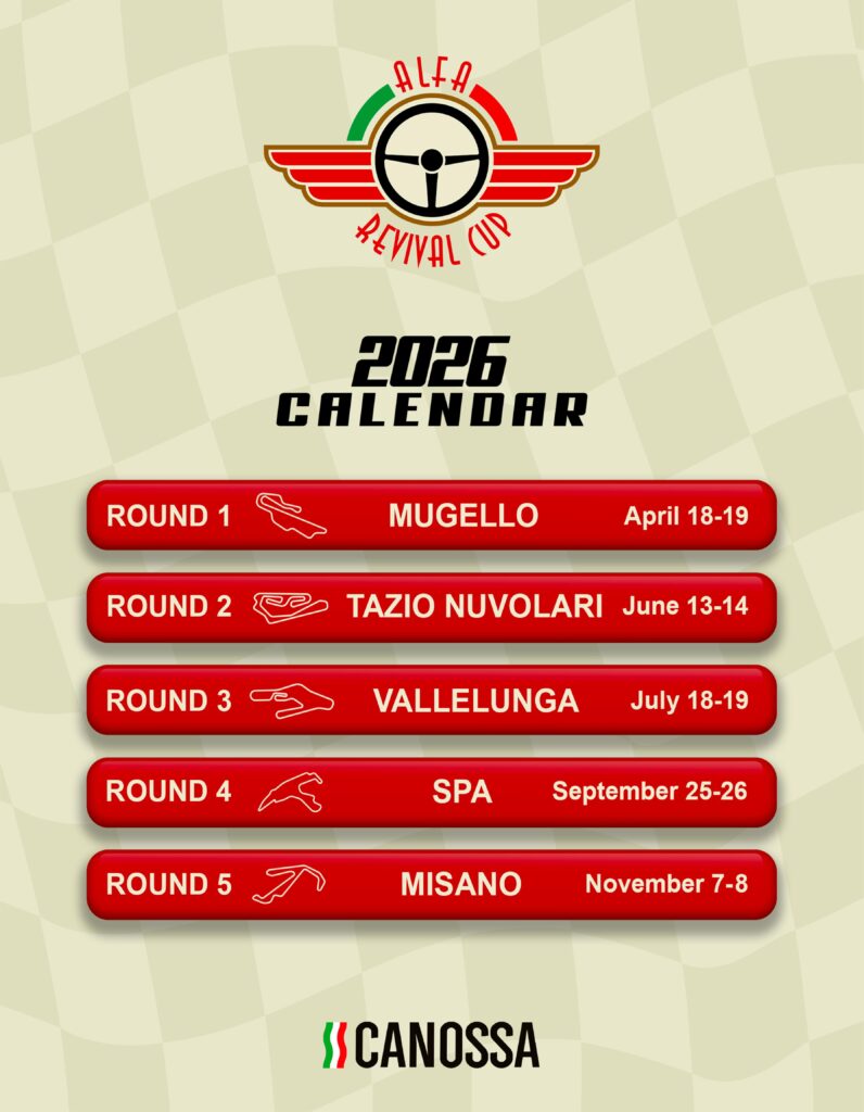 16 Gennaio 2026. L’Alfa Revival Cup è la serie promossa da Canossa e dedicata alle Alfa Romeo GT e Turismo costruite dal 1947 al 1981. Da oltre dieci anni il campionato celebra il patrimonio sportivo della Casa del Biscione, offrendo agli Alfisti un’esperienza autentica da vivere in circuito e nel paddock.
